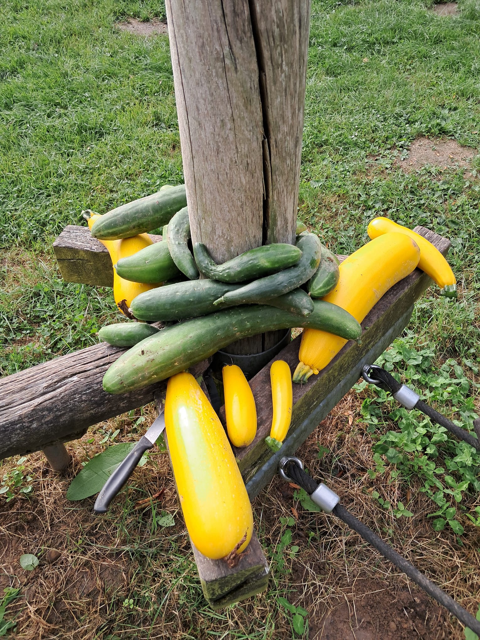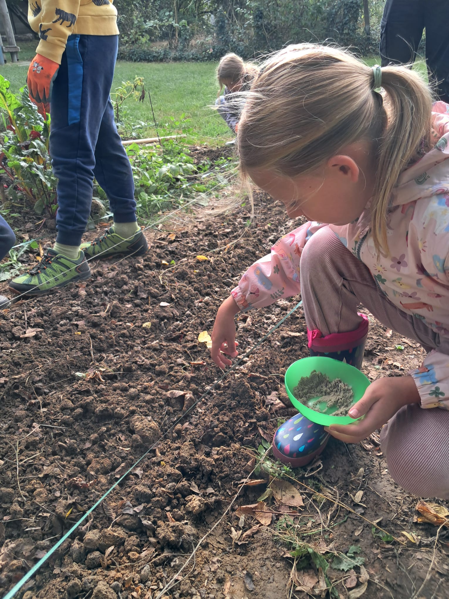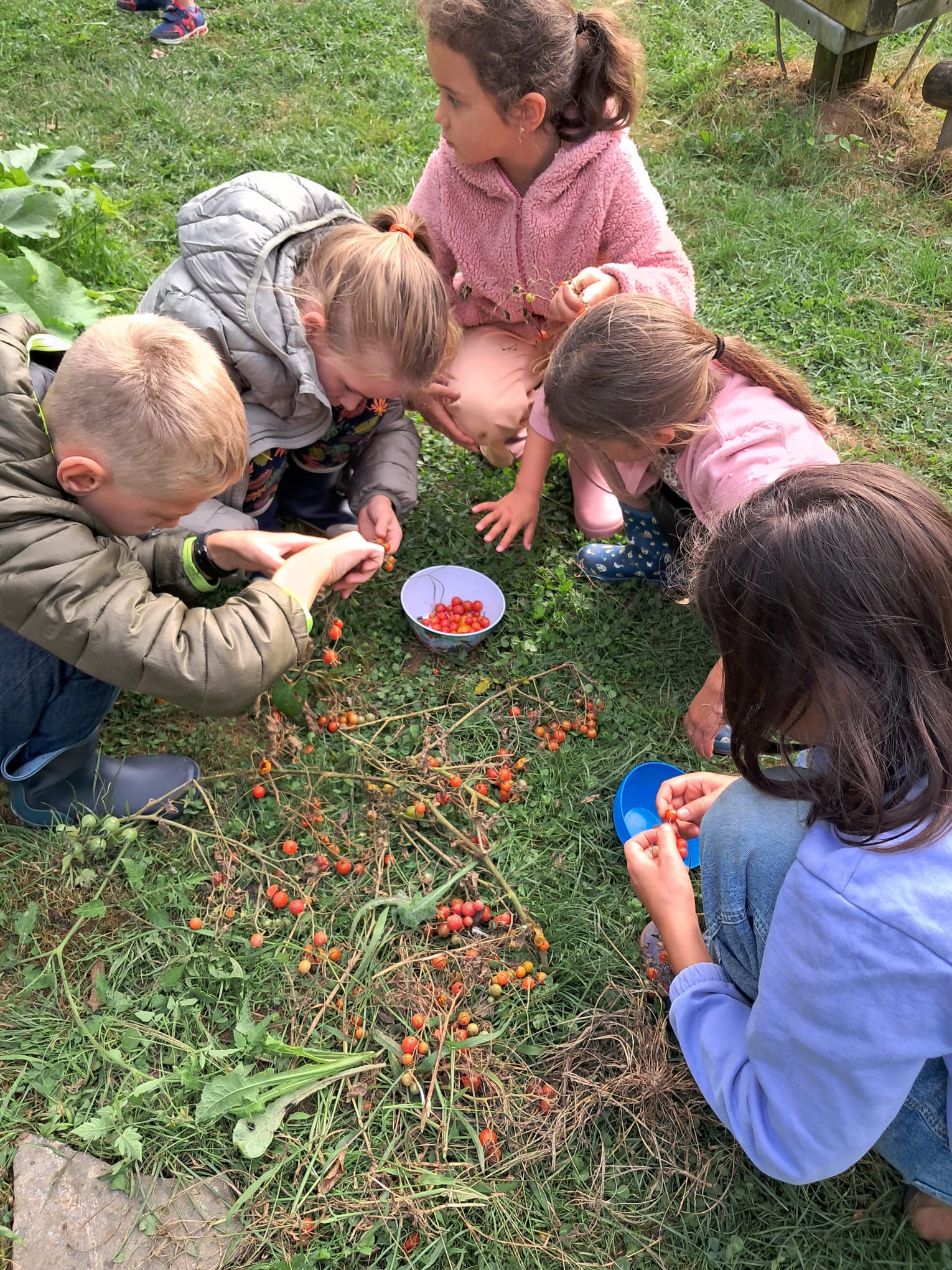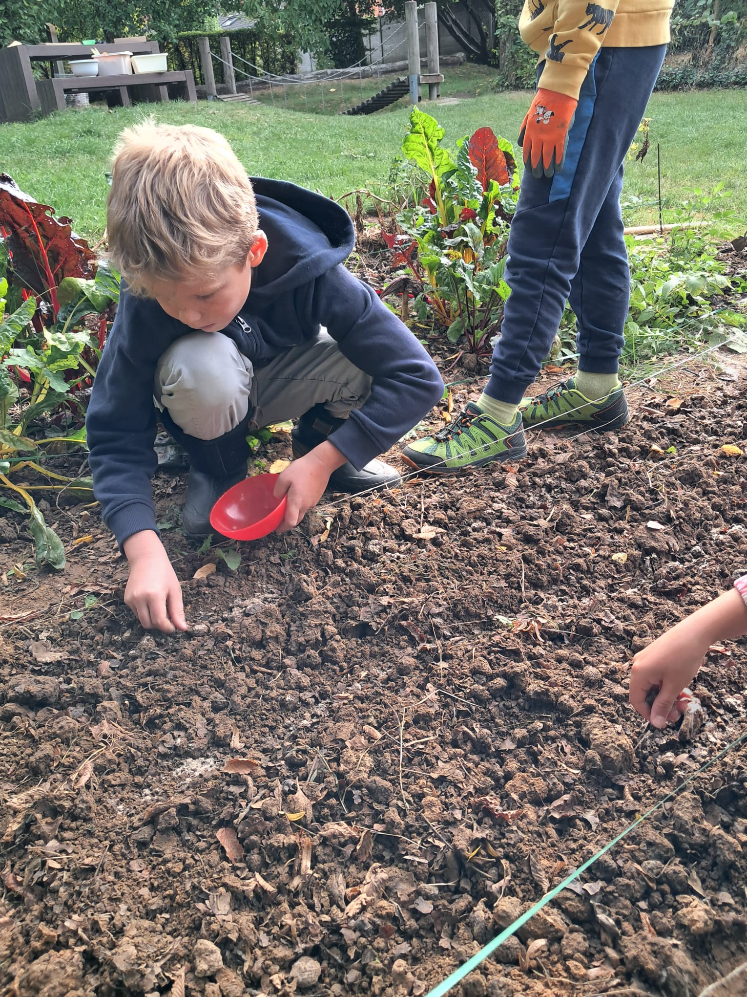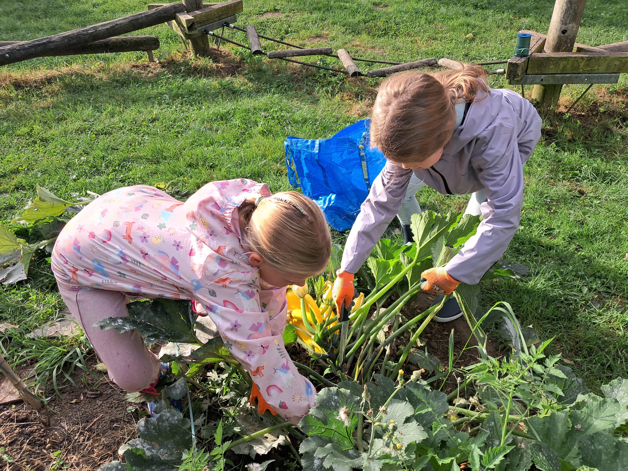 Während der Sommerferien haben uns Eltern fleißig bei der Pflege des Ackers unterstützt. Heute hieß es für die Kinder der Bären- und der Robbenklasse das erste Mal im neuen Schuljahr wieder: Raus auf den Natu und ackern! Es gab auch gleich wieder richtig viel zu tun: Blätter von den Zucchinipflanzen waren von Mehltau befallen und mussten entfernt, Unkraut gejätet und ein Beet für die Nachsaat vorbereitet werden. Hier haben wir neue Radieschen, Mairüben und Chinakohl gesät. Am meisten Freude jedoch hat den Kindern die reiche Ernte an gelben Zucchini, Tomaten und Gurken bereitet. Die Gurken und Tomaten wurden dann auch gleich in den Klassen zur Frühstückspause verspeist. Sie waren richtig lecker!