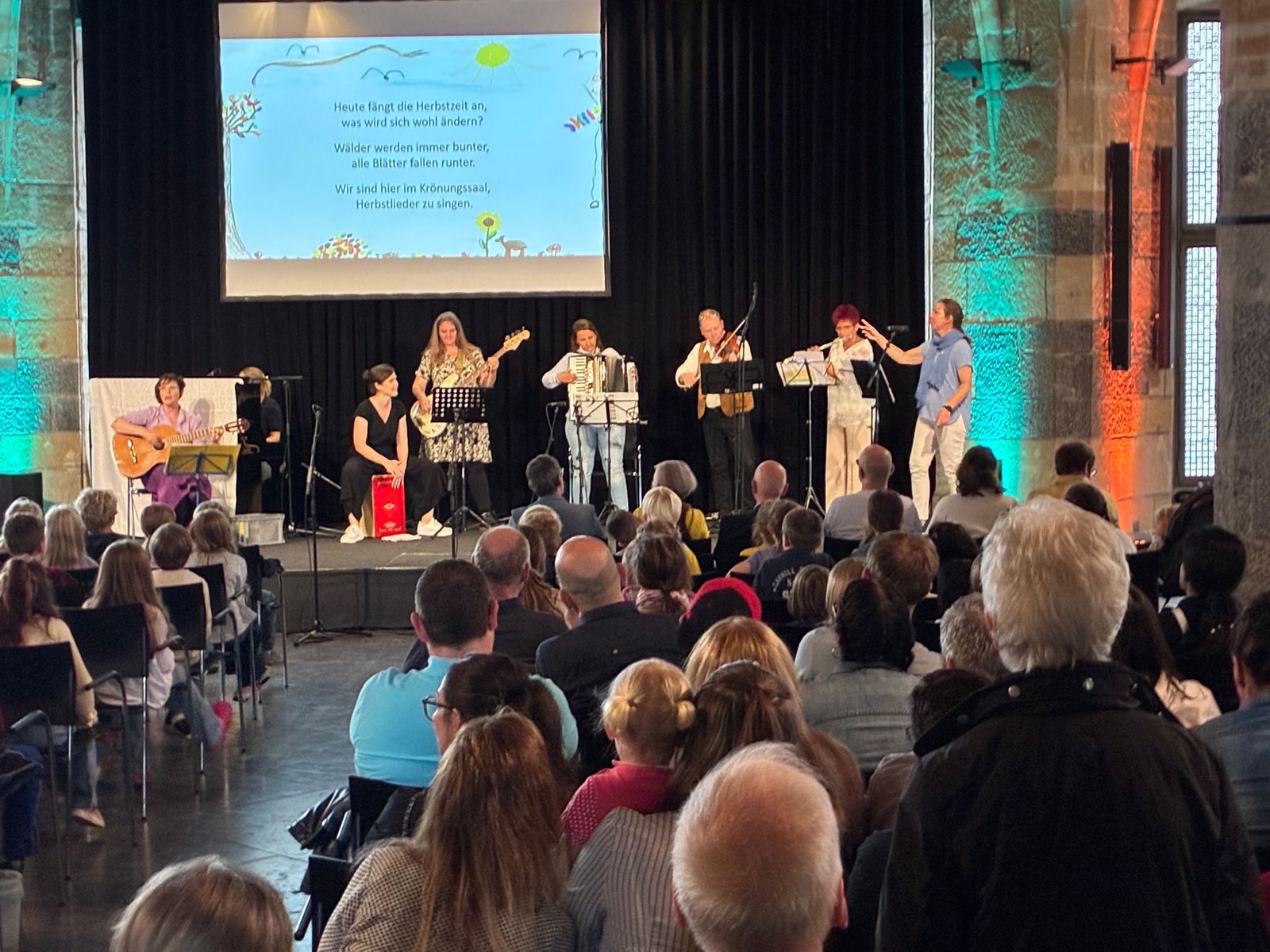 Bereits zum zweiten Mal fand im großen Krönungssaal des Aachener Rathauses das Herbstsingen für große und kleine SängerInnen statt. Dank Frau Pelkas unermüdlichem Engagement durfte in diesem Jahr auch eine Gruppe Pannesheider Kinder an dem Spektakel teilnehmen. Direkt zu Beginn ging es auf die Bühne, wo zunächst „Bunt sind schon die Wälder“ und anschließend „Hejo, spann den Wagen an“ geschmettert wurde. Beide Lieder wurden sogar als Kanon gesungen, was in der herrlichen Akustik besonders schön klang.