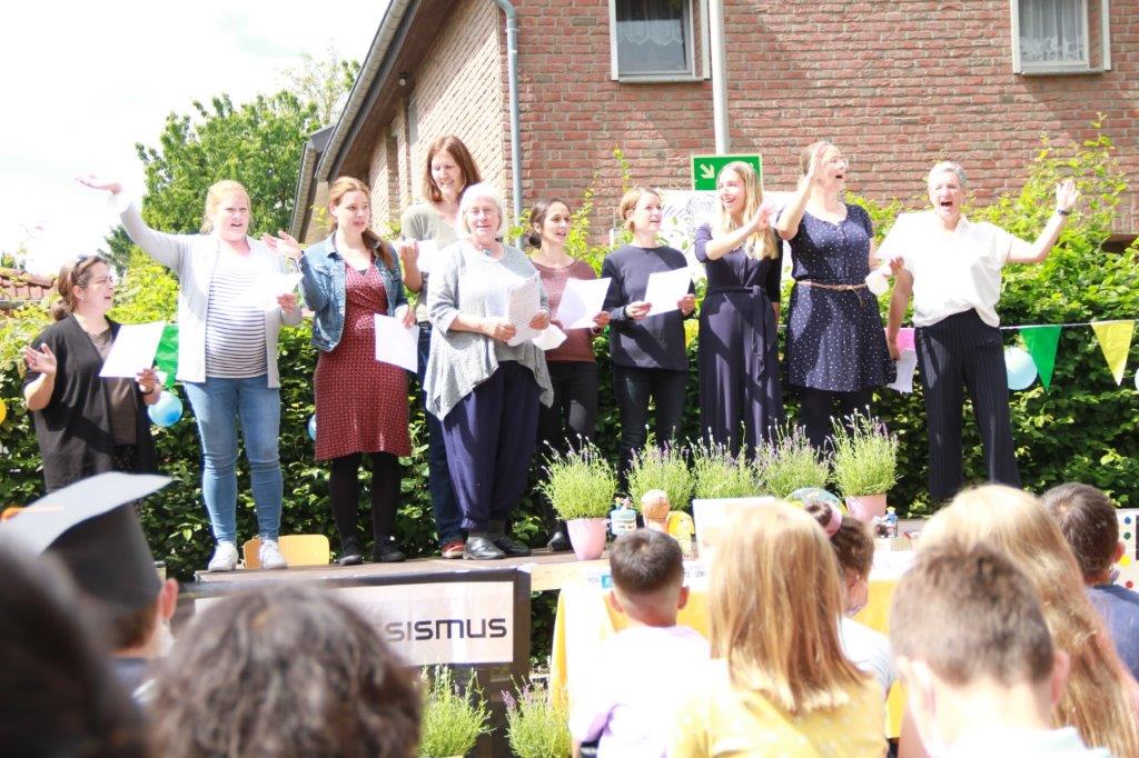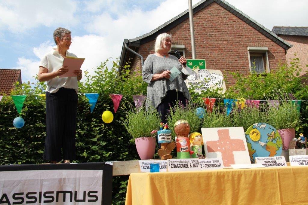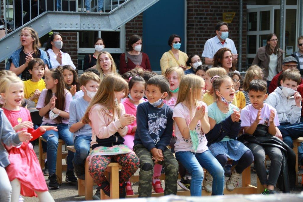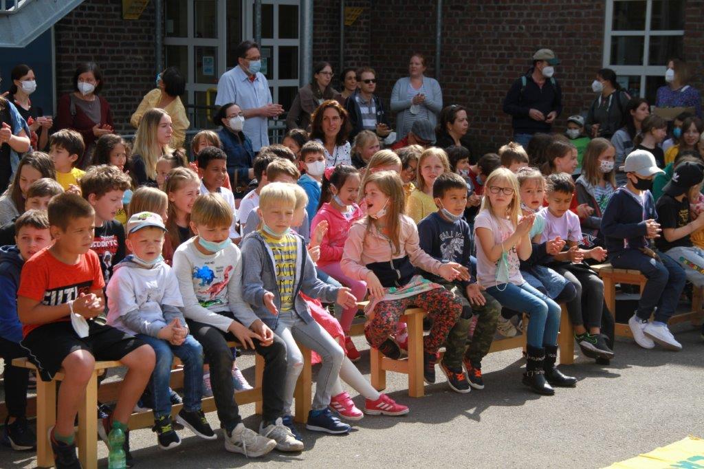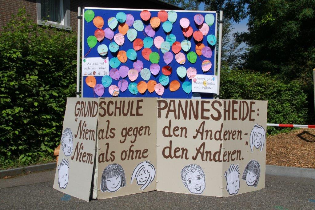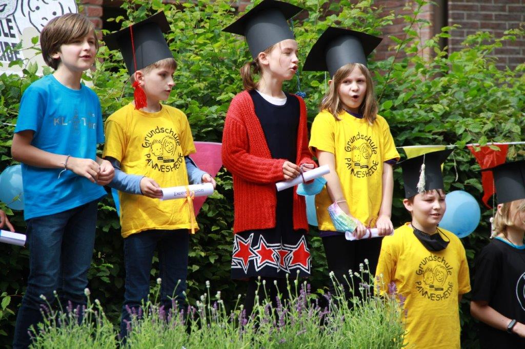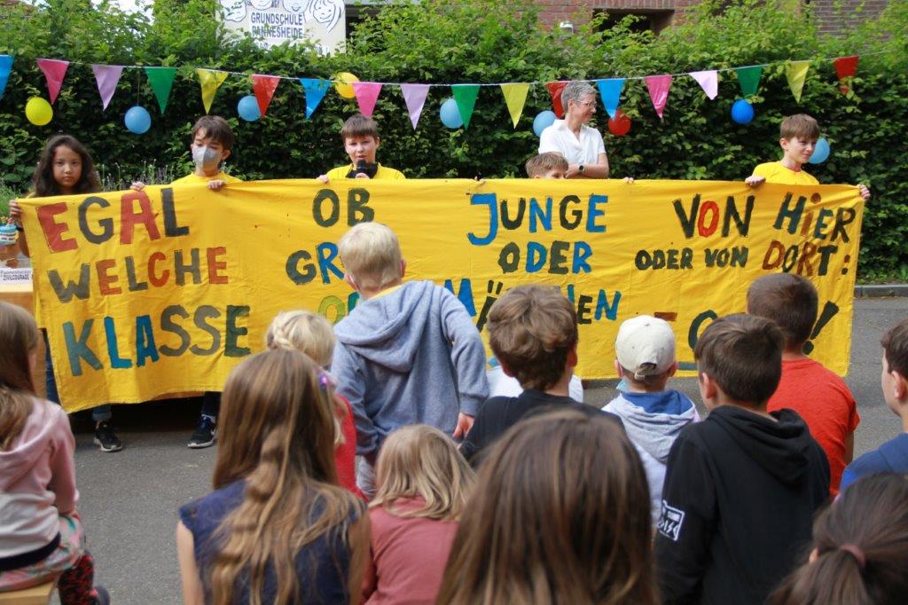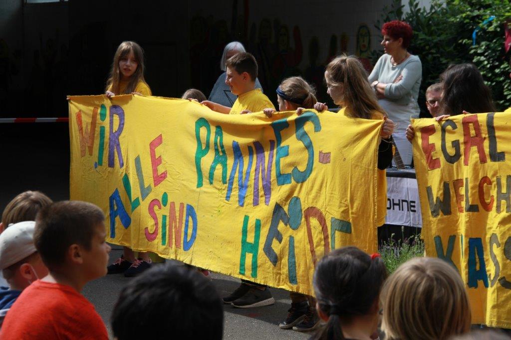 Am letzten Schultag wurden im Rahmen einer kleinen, aber feinen und vor allem bunten Feier unsere Vierties verabschiedet. Nach dem obligatorischen Schullied zu Beginn begrüßte Schulleiterin Ulrike Braun alle Kinder und Erwachsenen, bevor das Kipapa vor die Bühne trat, um ein selbst gestaltetes Banner hoch zu halten, welches den Fokus auf das Zusammengehörigkeitsgefühl aller Pannesheider Kinder richten sollte. Die Kinderparlamentarier hatten sich in der letzten Sitzung des Schuljahres dafür ausgesprochen, dass die Schulgemeinschaft nach den Wochen und Monaten auf Distanz unbedingt wieder mehr zusammen wachsen müsse. Dies wurde durch Jubel und Applaus lautstark bekräftigt!