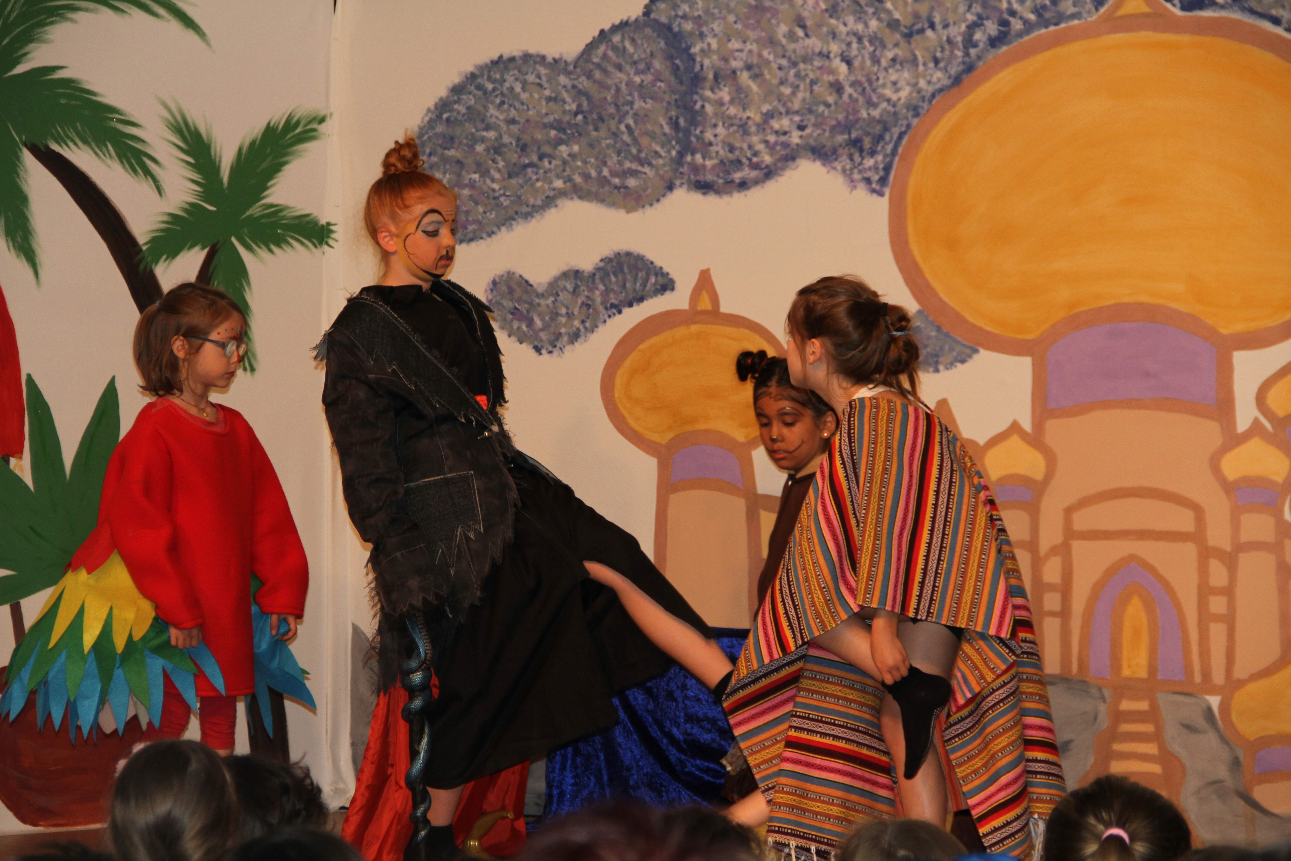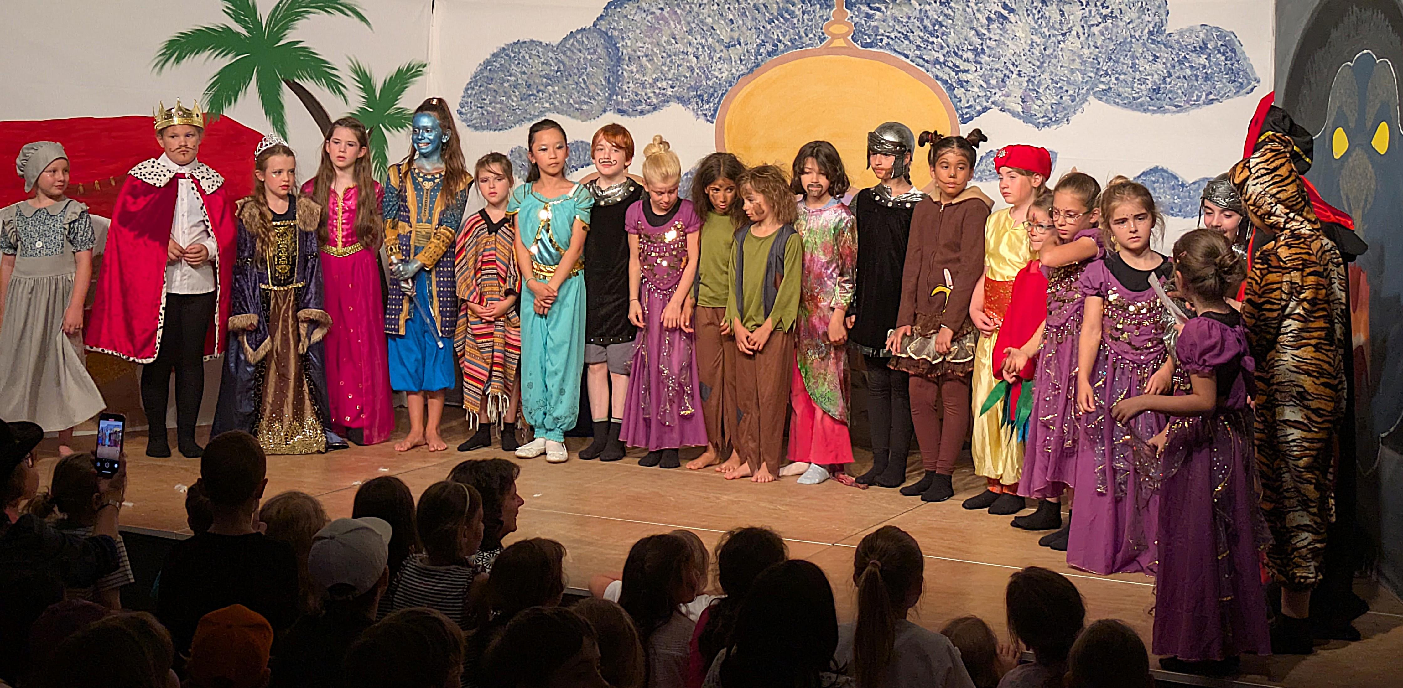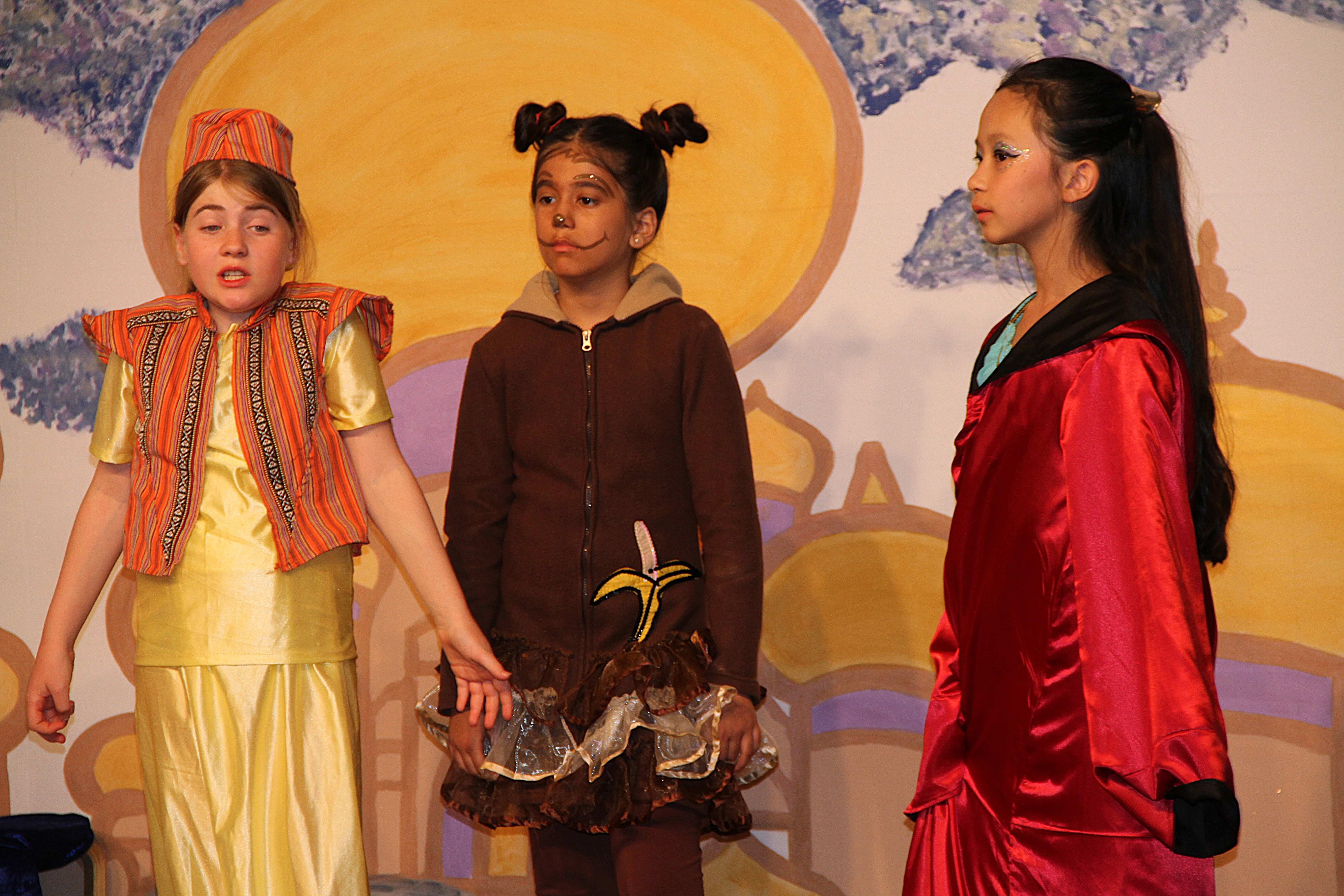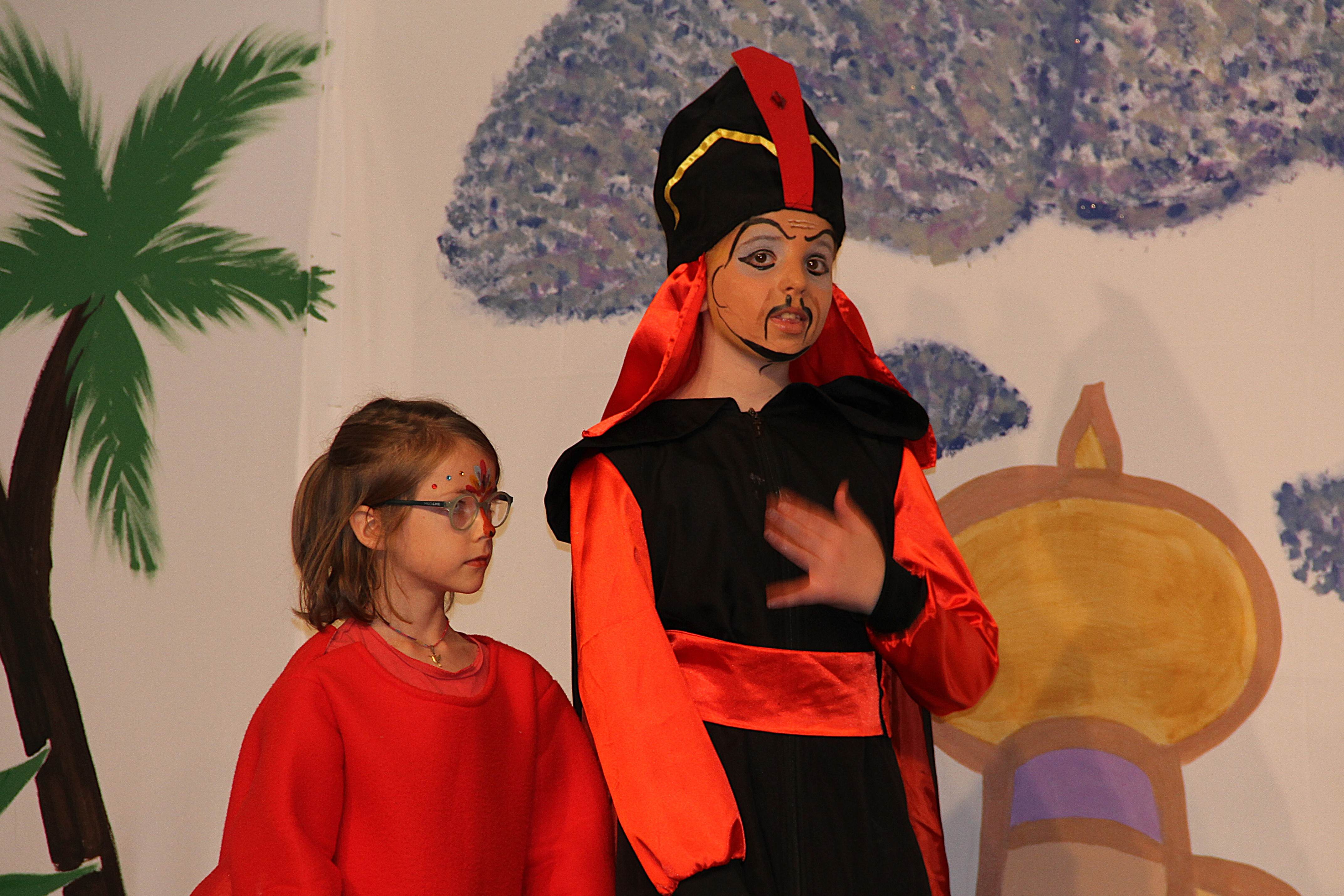 Am letzten Samstag vor Ende des Schuljahres fand traditionell wieder unser Schulfest statt. Bei perfektem Wetter, trocken, nicht zu warm und nicht zu kalt, konnte Frau Braun nach einem kleinen Bühnenprogramm das Fest offiziell eröffnen. Auf dem gesamten Schulgelände gab es zahlreiche bunte Spiel- und Bastelangebote. In der Mensa war wieder ein Wahnsinnsbuffet aufgebaut. Außerdem wurde leckeres Eis angeboten. Das Highlight des Schulfestes war sicherlich auch in diesem Jahr die Aufführung der Theater-AG, die diesmal das Stück "Aladdin" einstudiert hatte und das Publikum mit fantasievollen Kostümen und einem wunderschönen Bühnenbild in die Welt aus 1000 und einer Nacht entführte.