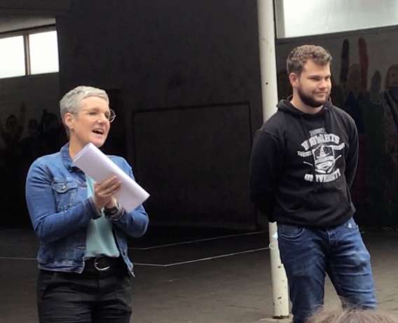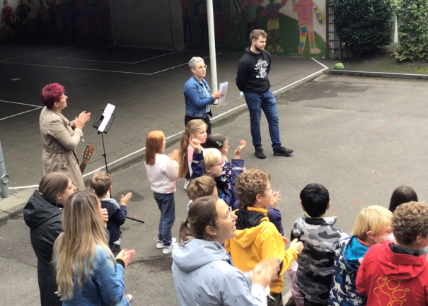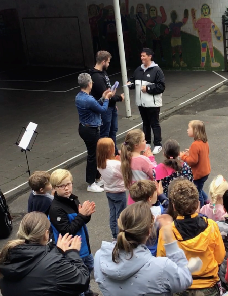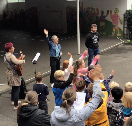Zum Abschied sangen alle zusammen zunächst das Schullied, bevor das Team den eigens getexteten Abschiedssong präsentierte und ein Abschiedsgeschenk überreichte. Hier und da flossen im Publikum auch ein paar Tränchen, die aber in der anschließenden Pause schnell wieder trockneten.