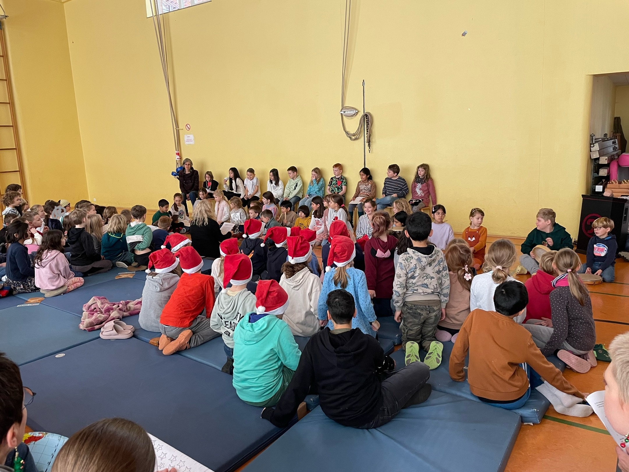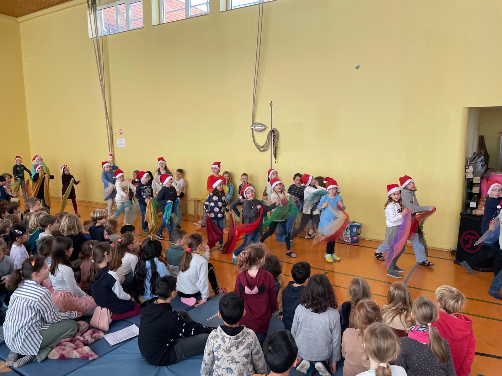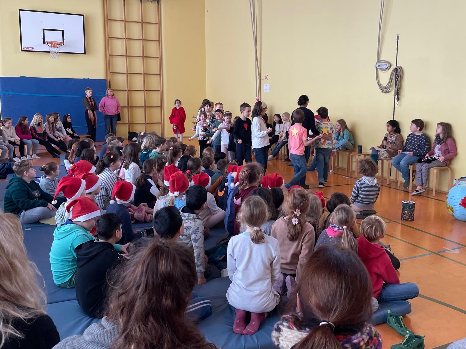 Traditionell haben wir uns alle im Rahmen einer gemeinsamen Weihnachtsfeier in der Turnhalle in die Ferien verabschiedet. Moderiert vom KiPaPa wurden verschiedene stimmungsvolle Darbietungen präsentiert. Mit weihnachtlichen Liedern, Gedichten und Tänzen verbrachten wir eine gute Zeit.