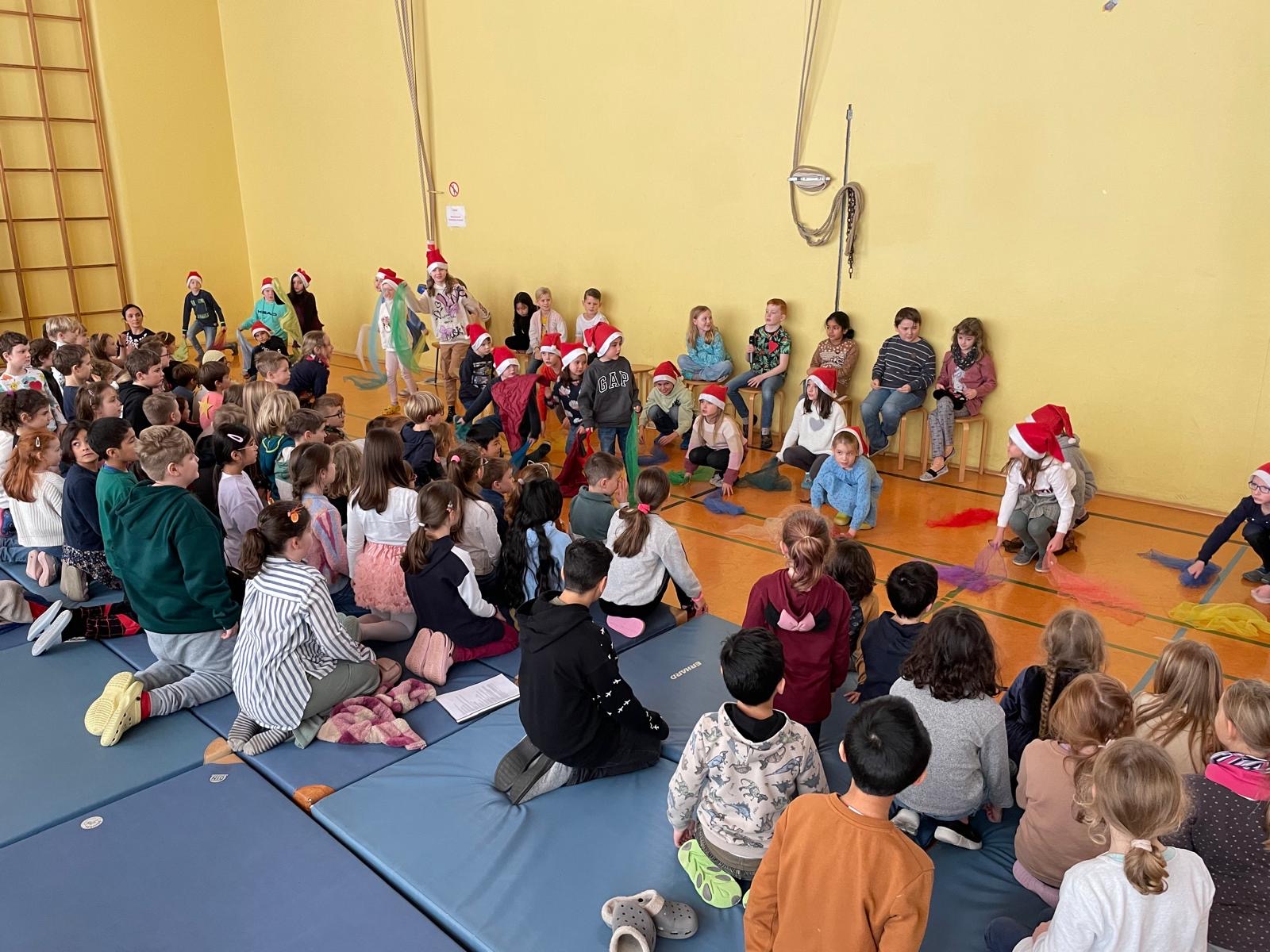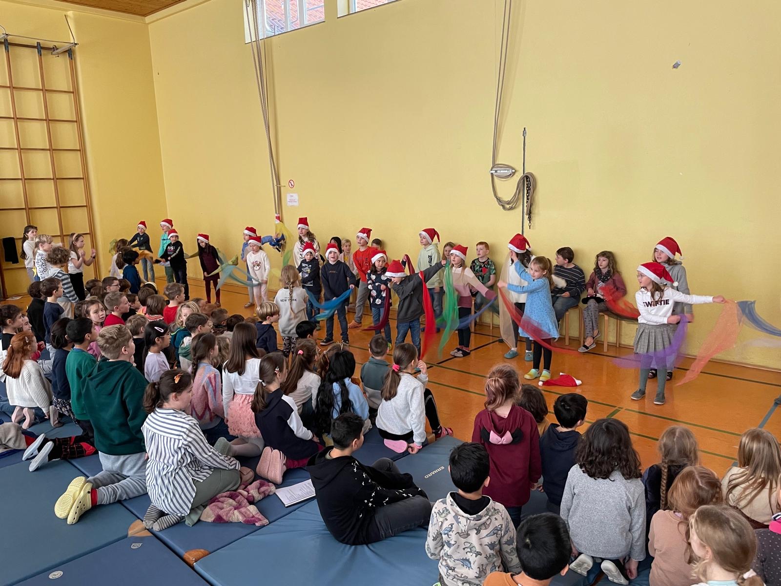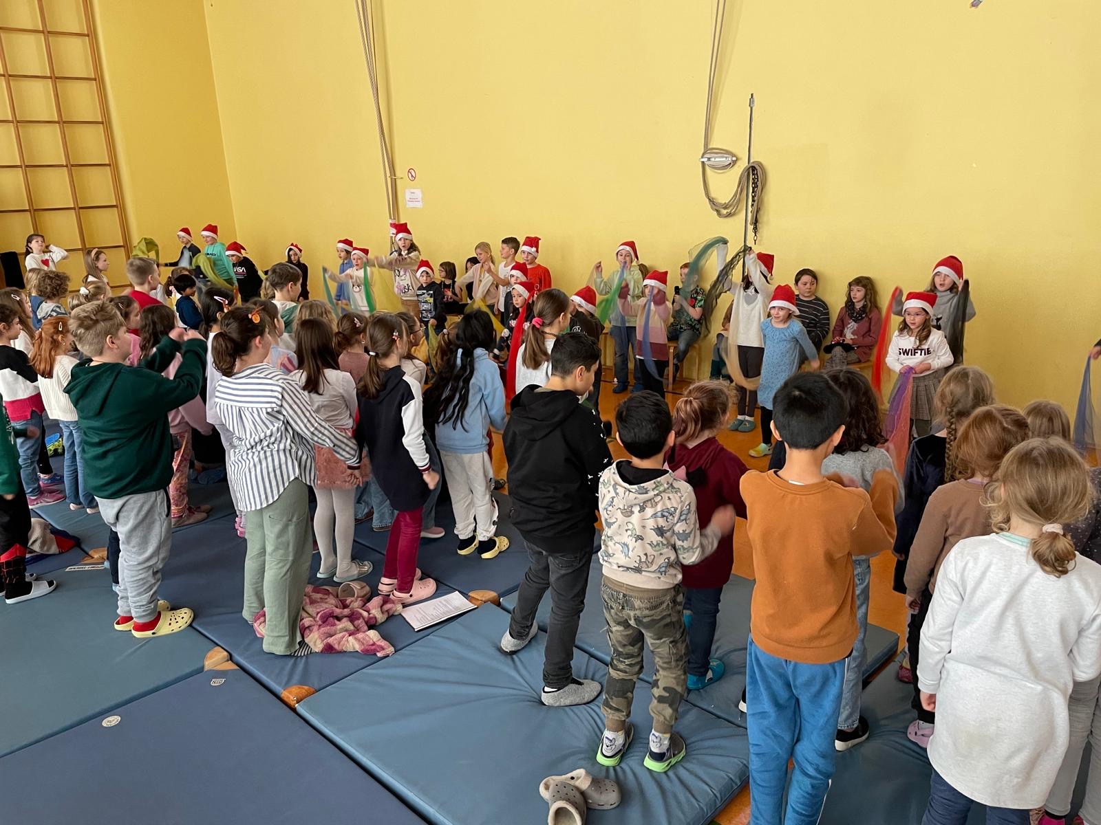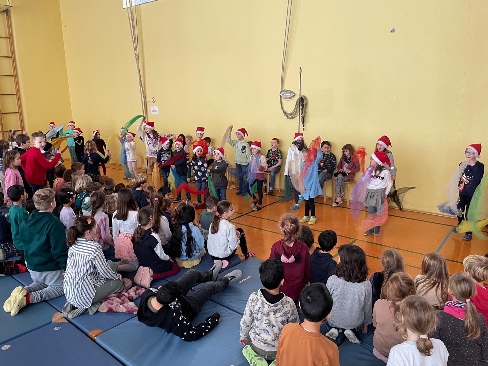 Traditionell haben wir uns alle im Rahmen einer gemeinsamen Weihnachtsfeier in der Turnhalle in die Ferien verabschiedet. Moderiert vom KiPaPa wurden verschiedene stimmungsvolle Darbietungen präsentiert. Mit weihnachtlichen Liedern, Gedichten und Tänzen verbrachten wir eine gute Zeit.