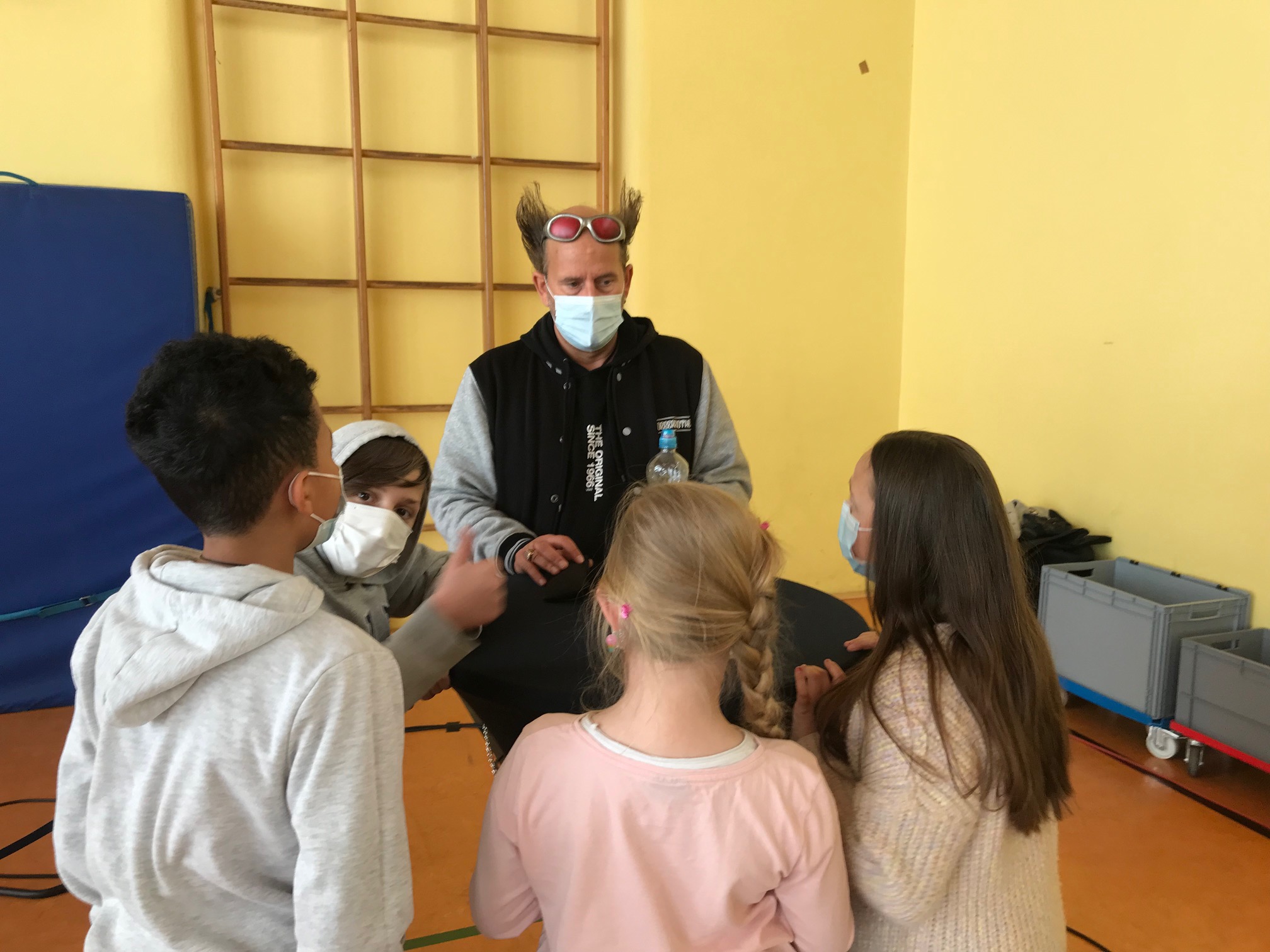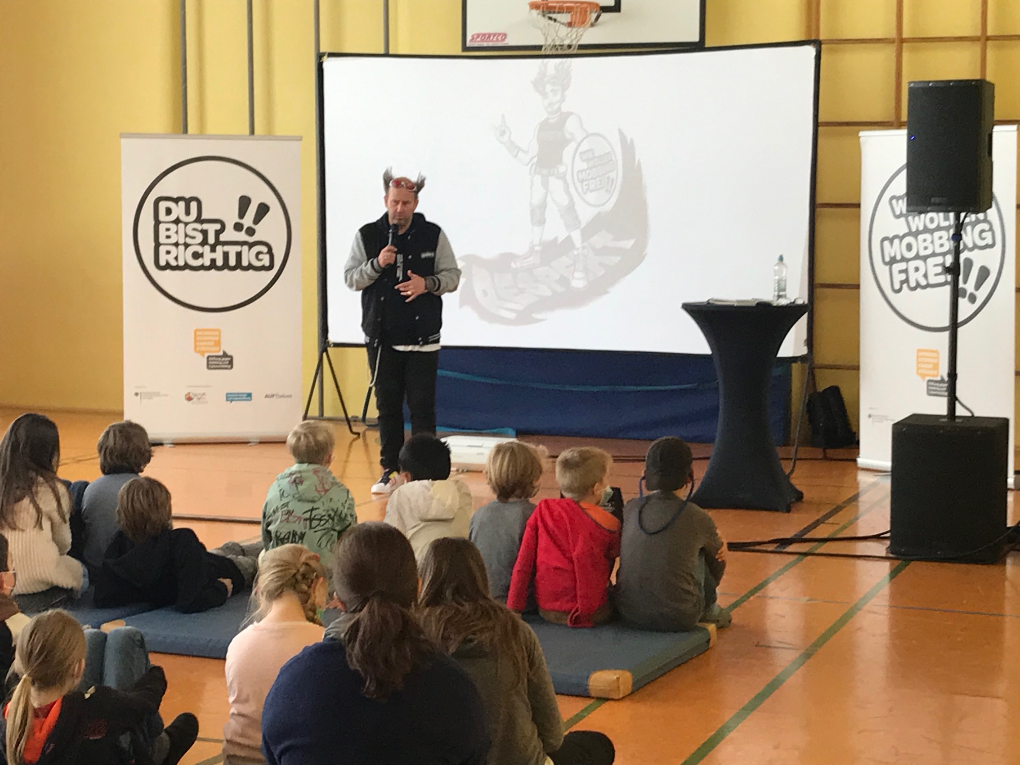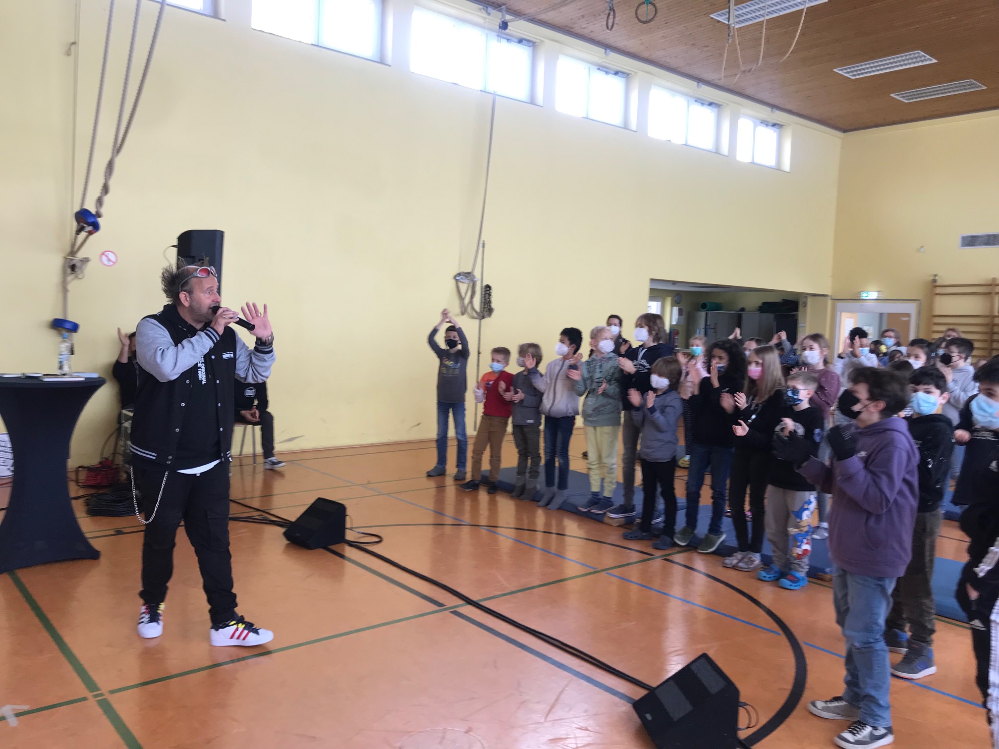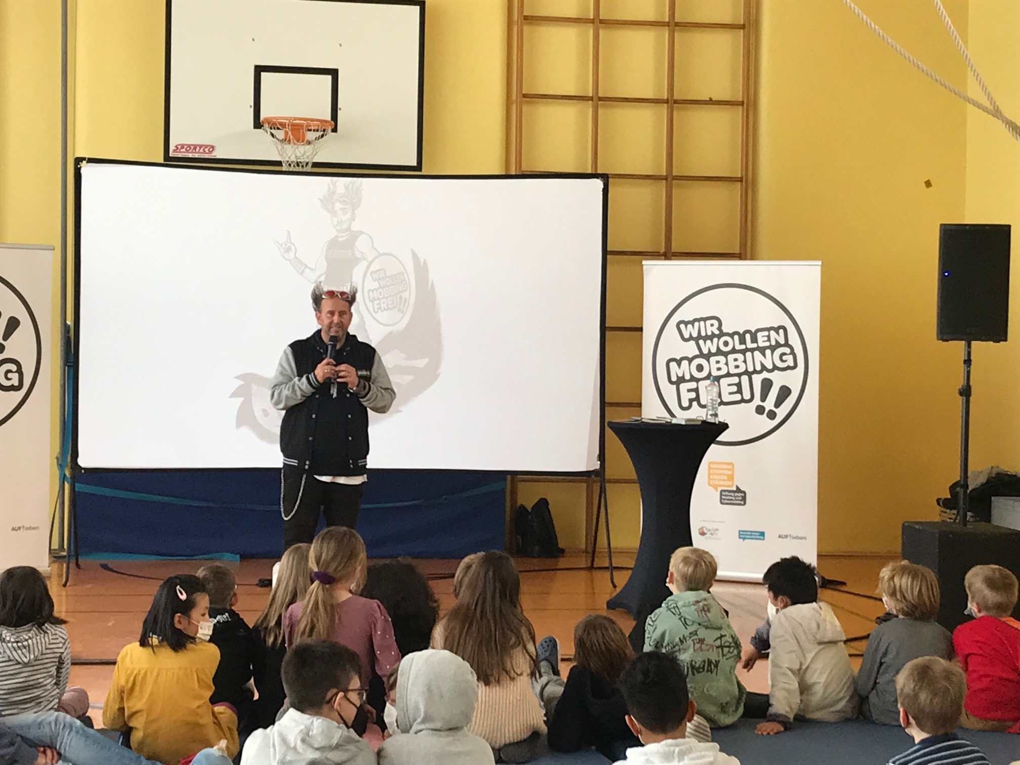 Am 30. März war Tom Lehel, bekannt vom KIKA, mit seinem Programm „Wir wollen mobbingfrei!“ bei uns zu Gast. Mit Geschichten aus seiner eigenen Kindheit und coolen Songs begeisterte er die Dritties und Vierties. Gemeinsam wurde thematisiert, was Mobbing überhaupt genau ist und wie man sich dagegen stark machen kann. Wichtig ist, dass man sich als Gruppe dafür einsetzt, dass es gar nicht erst zum Mobbing kommt und niemand ausgegrenzt wird; denn auch in Pannesheide wollen wir mobbingfrei!